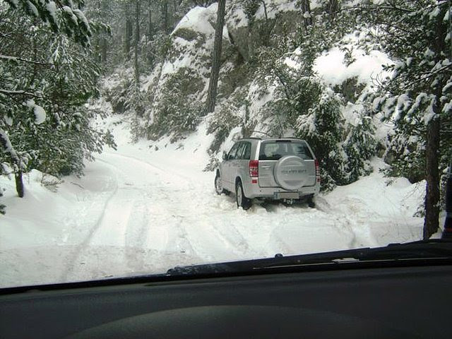 El coche dijo, niño si no te cambias las ruedas, hasta aquí he llegado yo, así que me bajé del coche y le puse las cadenas en las ruedas delanteras, ande un trozo y a las bajadas el culo me quería adelantar todo el rato, así que volví a bajar y le puse también las de atrás.